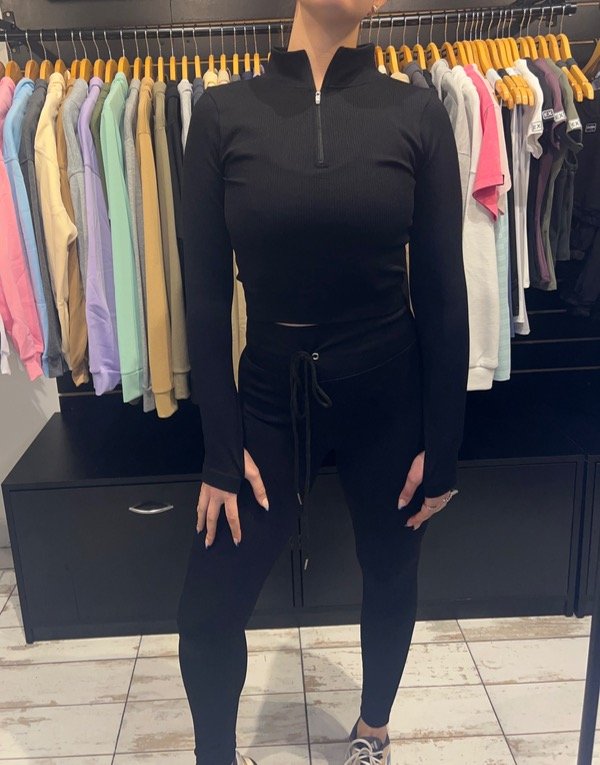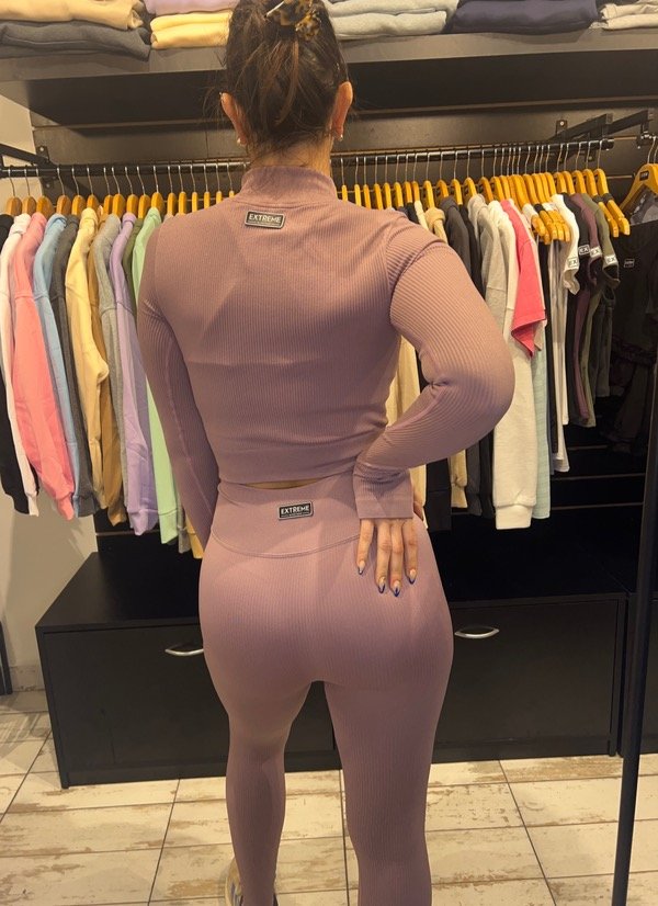Conjunto sin costuras de tela gruesa y acanalada. Pantalón al cuerpo sin frunce y con cordón.